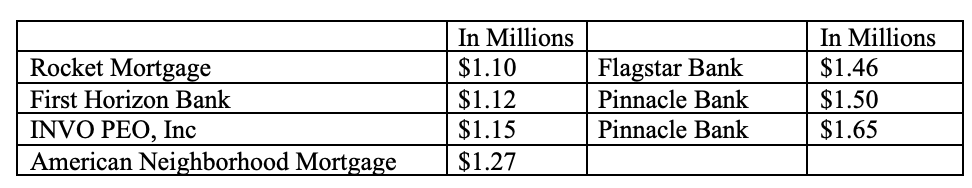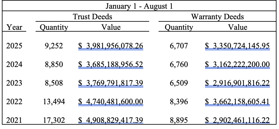 Recapping July, a total of 6,346 documents were recorded. New loans accounted for 1,492 transactions valued at $482.4 million. The highest value loan of the month was $9 million, funded by Protective Life Insurance Company. Second on the list was $6.8 million provided by Encore SFR Finance, LLC, and the third was $5.08 million loaned by Mountain Commerce Bank.