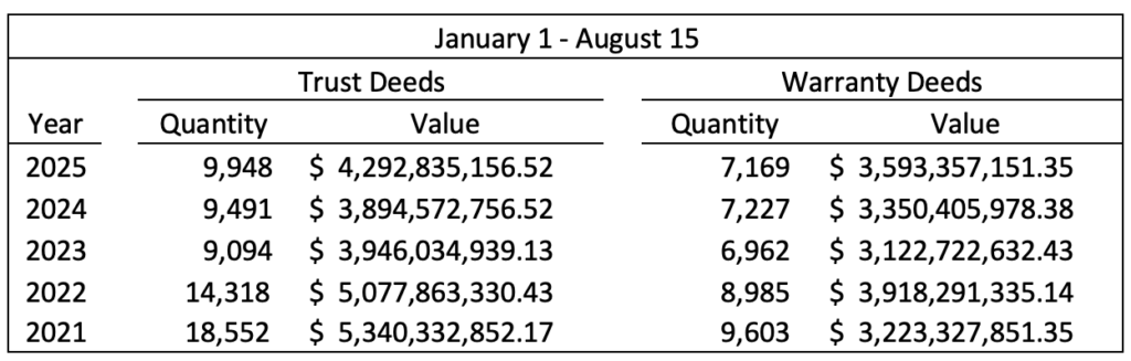 The week of August 11-15, 2025, was a busy one! We recorded 1,449 documents, including 338 trust deeds with a cumulative value of $209.97 million. Among the loans were 19 valued at $1 million or more. The largest of these was $26 million loaned by Berkadia Commercial Mortgage, LLC. The second highest came in close to that at $25.57 million, backed by First Horizon Bank. The 17 other high value loans are outlined below: