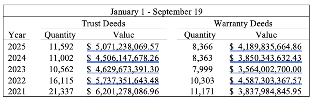 It is hard to believe that September is coming to an end already! During the week of September 15-19, 2025, a total of 1,359 documents were added to Knox County’s property records. Among those were 299 loans valued at $ 148.67 million. The highest-valued loan was funded by Walker & Dunlop LLC, for $41.38 million. Renasant Bank loaned $9.12 million. Y-12 Federal Credit Union loaned $8.21 million, and Capital One Bank N. A. backed a loan of $7.5 million. The other large mortgages are below: