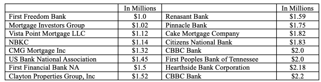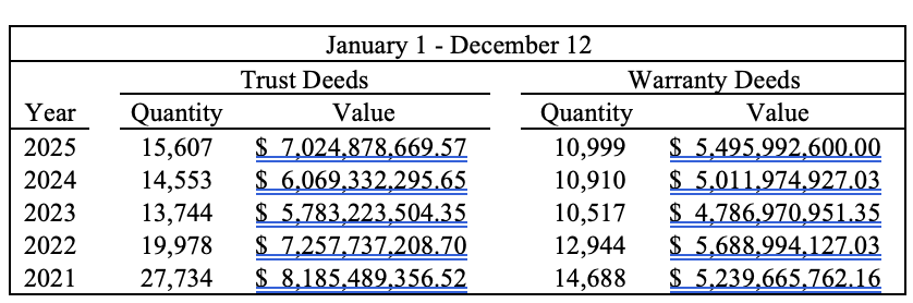 During the week of December 8-12, 2025, a total of 1,612 documents were added to the Knox County property records. Trust deeds recording loans accounted for 390 transactions valued at $192.26 million. Nineteen loans exceeded $1 million, with the largest being a $55 million loan from BMO Bank, NA. The second and third-largest loans of the week were both funded by Home Federal Bank of Tennessee. One was $6 million, and the other was $5.52 million. The other high-value loans are outlined below: