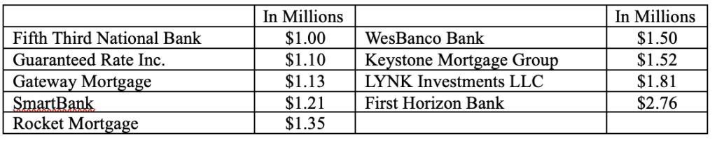 As for real estate lending, we recorded 371 trust deeds with a total value of $151.82 million. Dwight Mortgage Trust recorded the largest loan at $21.7 million. Pinnacle Bank was on the list twice, with the second-largest loan at $7.6 million and a second loan of $2.46 million. Renasant Bank appeared on the high-value mortgage list three times, backing loans totaling $2.1 million, $1.405 million, and $1.403 million. The other loans over $1 million are outlined below: