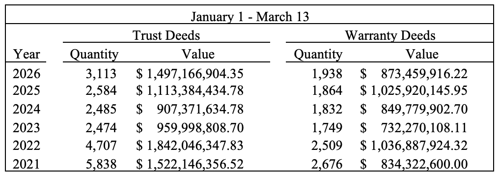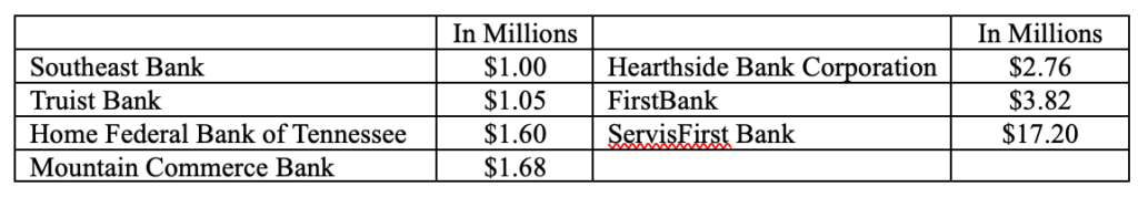 During the week of March 9-13, the Register’s office recorded 1,318 new documents. Loans accounted for 327 of those presented as trust deeds with an aggregate value of $310.43 million. That is more than double the total value of loans for the week prior, largely due to just two loans. The largest of the week was $82.84 million, funded by Walker & Dunlop, LLC. The second largest loan, $26.35 million, was funded by Home Federal Bank of Tennessee. The other lenders funding $1 million or more are below:
